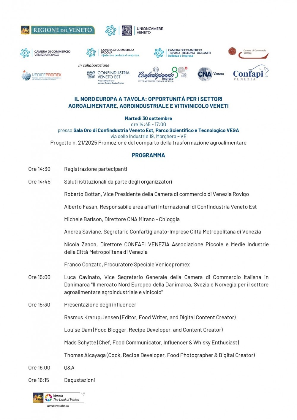 Martedì 30 settembre ore 14:45 - 17:00 presso Sala Oro di Confindustria Veneto Est, Parco Scientifico e Tecnologico VEGA via delle Industrie 19, Marghera – VE Progetto n. 21/2025 Promozione del comparto della trasformazione agroalimentare