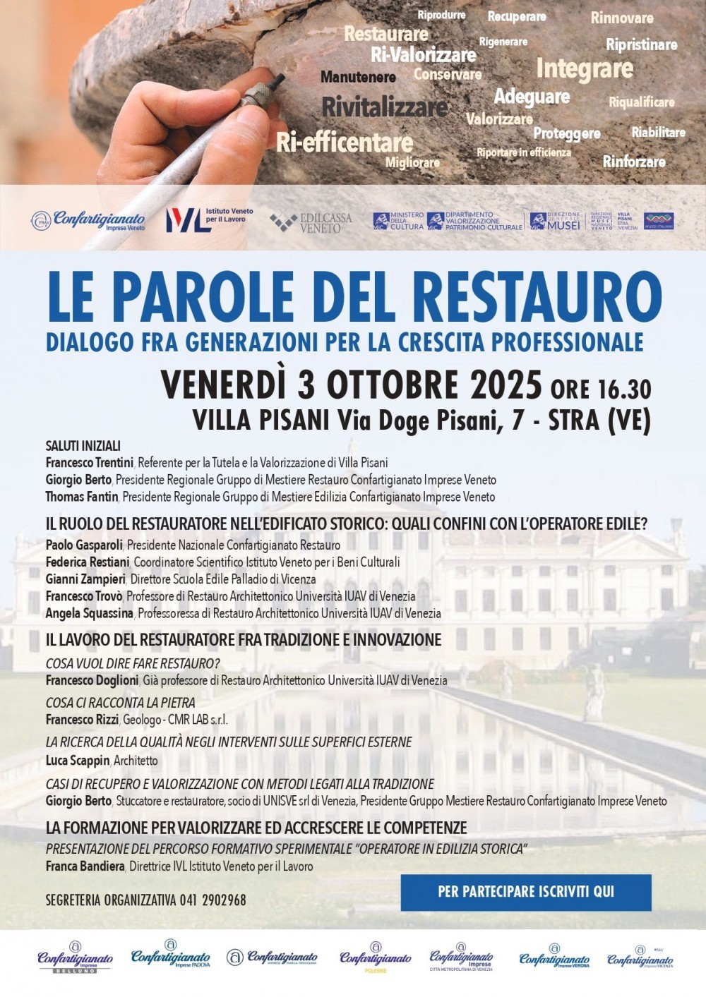 Il convegno avrà luogo venerdì 3 ottobre ore 16.30, nella prestigiosa Sala Nobile di Villa Pisani a Strà (Ve) e vedrà, tra i relatori, anche il “nostro” Giorgio Berto, Presidente Regionale Gruppo di Mestiere Restauro Confartigianato Imprese Veneto.